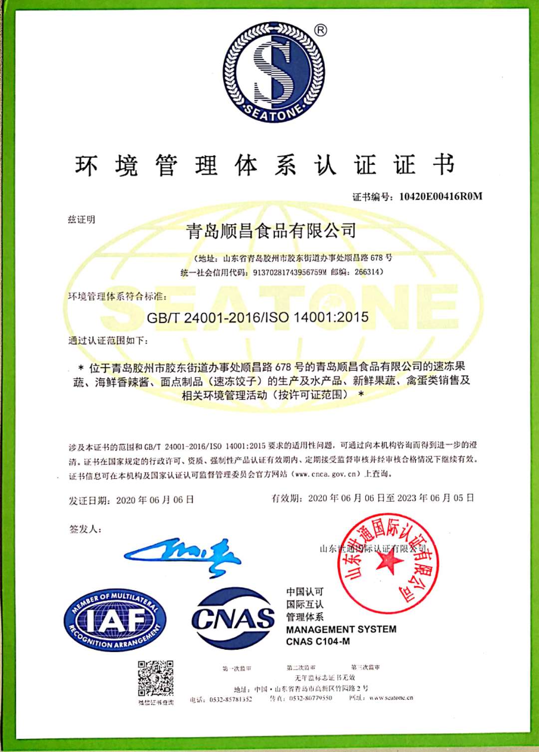 環(huán)境管理體系認證證書